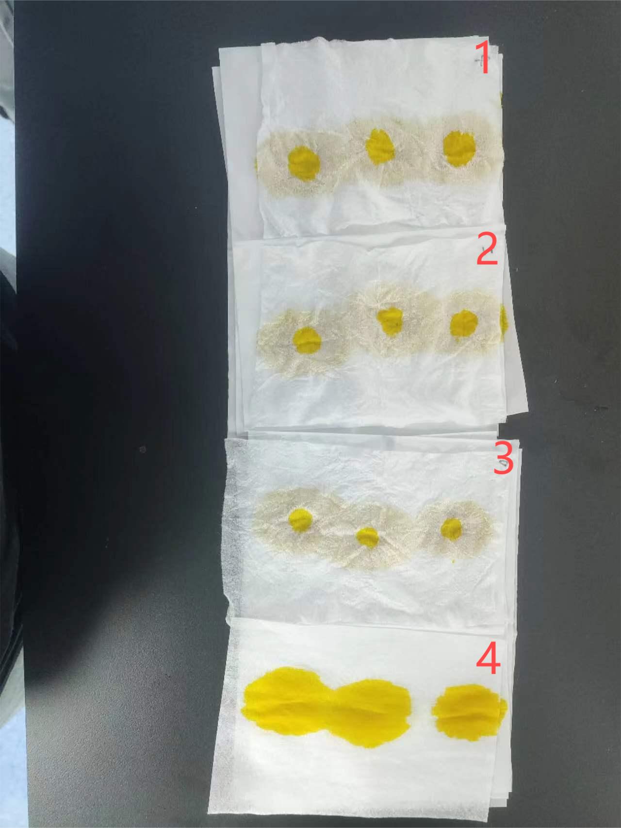 1、2、3是衛(wèi)生巾表層處理后樣品布,4是衛(wèi)生巾表層原布。從現(xiàn)場實驗可看出,經(jīng)過拓瑞衛(wèi)生巾表層處理劑處理后的布,能實現(xiàn)定點(diǎn)滲透、強(qiáng)大防反滲性能,真正做到“正面一點(diǎn)點(diǎn),反面一大片”。讓液體遠(yuǎn)離皮膚,保持皮膚干燥,減少對皮膚的刺激。